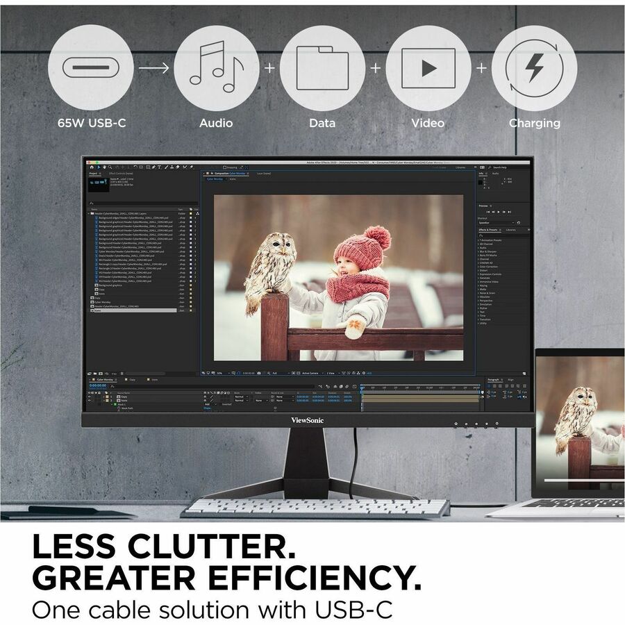 The ViewSonic® VX2467U is a 24" Full HD monitor that combines style with optimal versatility and functionality. Whether for streaming, editing or gaming, these sleek and slim displays are engineered with the everyday user in mind and are perfect for home use. With a 3-sided frameless design, this monitor provides a near-seamless viewing experience ideal for multi-monitor setups. USB 3.2 Type-C connectivity delivers 65W charging power, video, and audio over a single cable, while HDMI and VGA inputs keep you connected to your favorite devices.