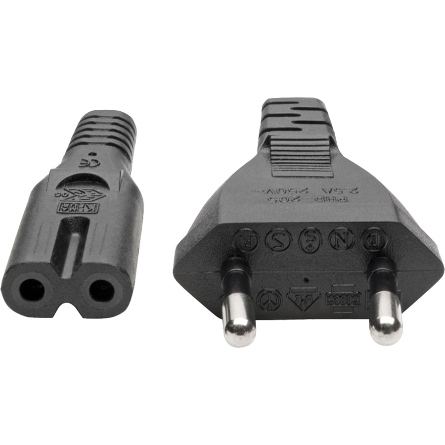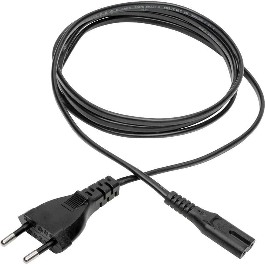 The P059-006 2-Prong Europlug Computer Power Cord features a C7 plug on one end and a CEE 7/16 plug on the other. This allows you to connect any device with a C8 port to a grounded AC power outlet in many countries in Europe, Africa, South America, Asia, Russia and the Middle East. Simply connect the C7 plug to a device and the CEE 7/16 plug to a UPS, PDU or AC wall outlet. Take the heavy-duty P059-006 with you on a trip abroad or replace an old or lost power cord. This six-foot (1.8-meter) 250V/2.5A cord features H03VVH2-F 2G 0.75mm² flat wire, a flexible PVC jacket and fully molded ends for optimum performance.