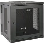 The SRW10US 10U Wall Mount Rack Enclosure Cabinet is designed to integrate wall-mounting, easy equipment access, and cable management in IT network applications with limited floor space. Ventilated front door and side panels allow generous airflow to keep equipment operating safely. Adjustable rack rails with square mounting holes accommodate up to 10U of standard 19" rackmount equipment. Supports up to 140 lbs of equipment. A sturdy hinge between the cabinet and the wall-mount bracket allows the cabinet to swing away from the wall for easy access to equipment and cabling. Top and bottom panels include convenient cutouts for cable routing. Meets all enclosure requirements towards PCI DSS (Payment Card Industry Data Security Standard) compliance.
