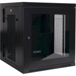 The SRW12USG SmartRack 12U Low-Profile Switch-Depth Wall-Mount Rack Enclosure Cabinet is designed to house EIA-standard 19-inch rack equipment in network wiring closets, retail locations, classrooms, back offices and other areas with limited floor space where you need equipment to be secure, organized and out of the way. Constructed from heavy-duty steel with a durable black powder-coated finish, the cabinet has a maximum load capacity of 200 pounds.The front door features a shatter-resistant clear acrylic window that lets you monitor equipment readouts without unlocking the enclosure. Not only does the window help prevent equipment tampering and reduce acoustic noise, but it also adds visual flair to your IT installation. The cabinet swings away from the wall on a sturdy hinge, allowing easy back-door access to equipment and cabling during installation and maintenance. The doors and side panels lock securely to help prevent damage, tampering or theft. The top, bottom and removable side panels are vented, which allows air to flow freely and keep equipment cool. The reversible doors can open left or right by rotating the cabinet 180° before mounting. Convenient top and bottom ports allow easy cable routing. The SRW12USG comes fully assembled and ready to mount to the wall, or use Tripp Lite's optional SRCASTER rolling caster kit to make it a mobile rack. Square and threaded mounting holes and numbered rack spaces make equipment installation easy. The vertical mounting rails adjust in 7/8-inch increments to accommodate equipment up to 20.5 inches deep, such as network switches and patch panels.