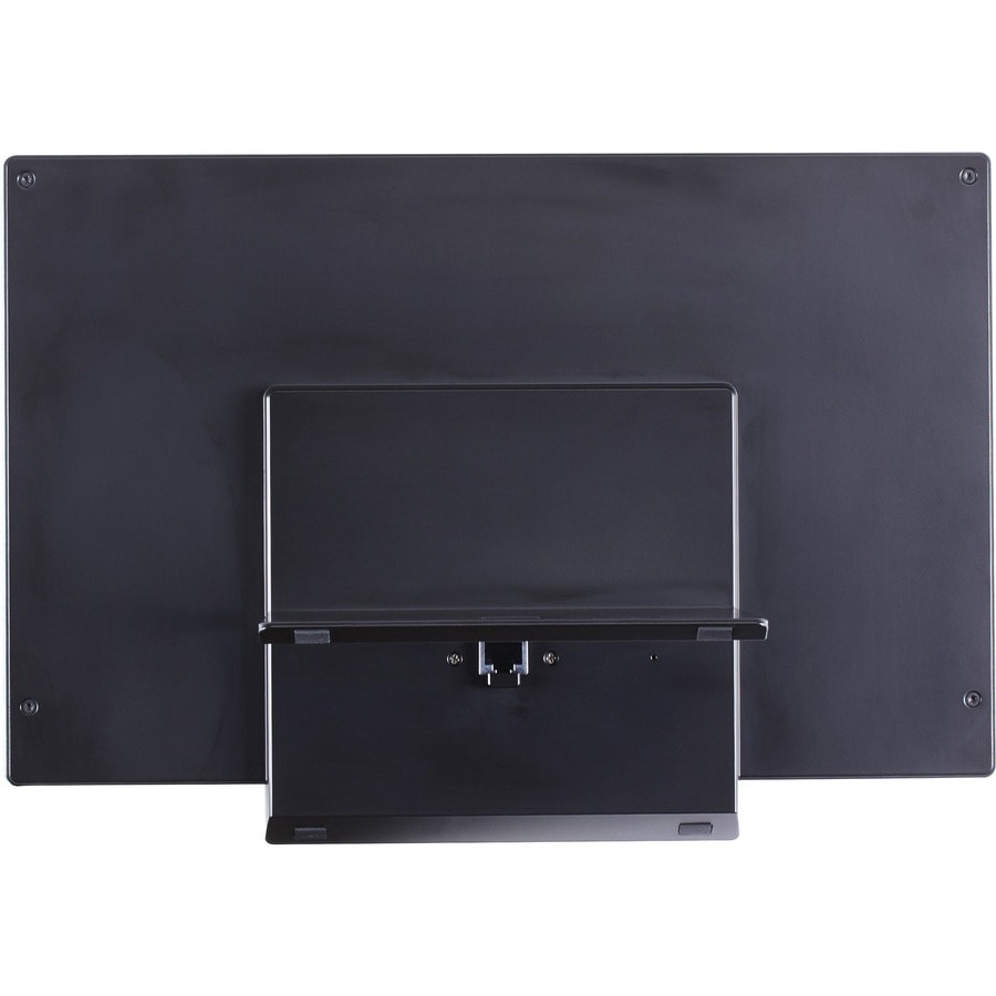 The touch panel features a clean, modern design with an edge-to-edge glass front. The slim, low profile aluminum body includes a tabletop stand. It's designed to sit on tables without obstructing views. And, the Ethernet cable connection is hidden in the back.